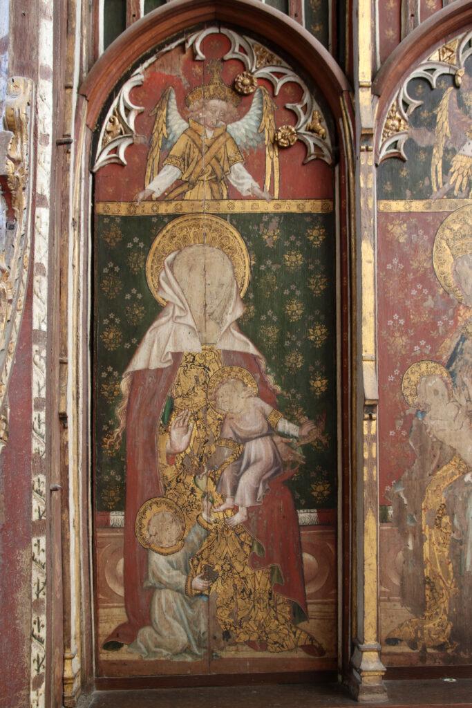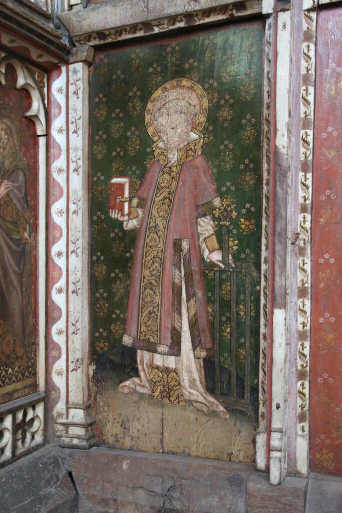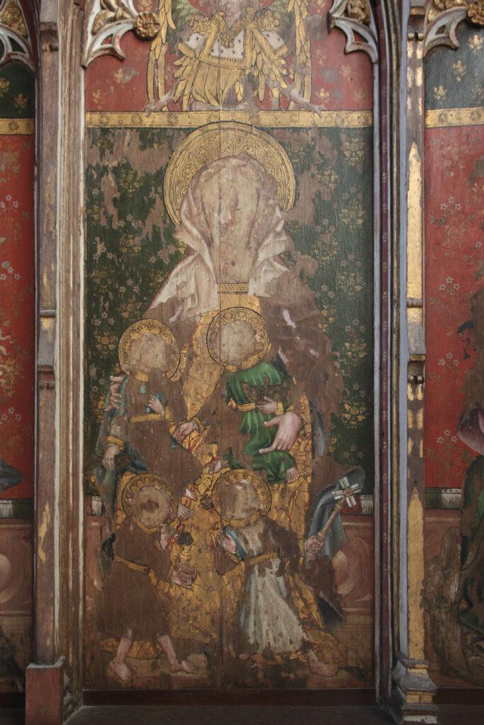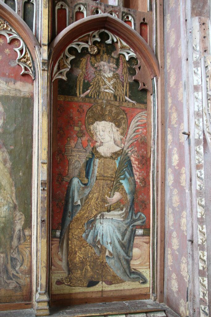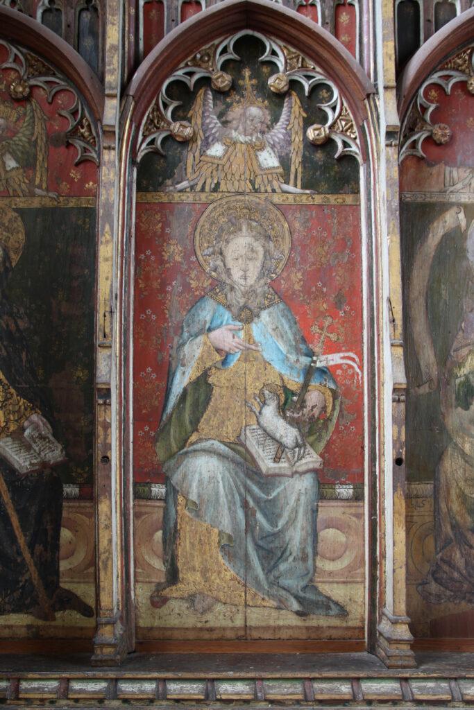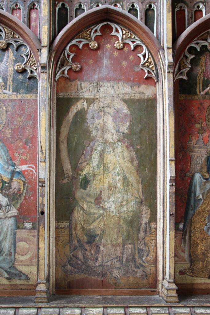 Behind the altar to the north, the screen is decorated with a series of panels containing figures of seated saints. To the far left there is St Etheldreda, the Anglo-Saxon abbess of Ely, and to the far-right St Barbara and early Christian martyr and one of the ‘holy helpers’ who was invoked against sudden death.