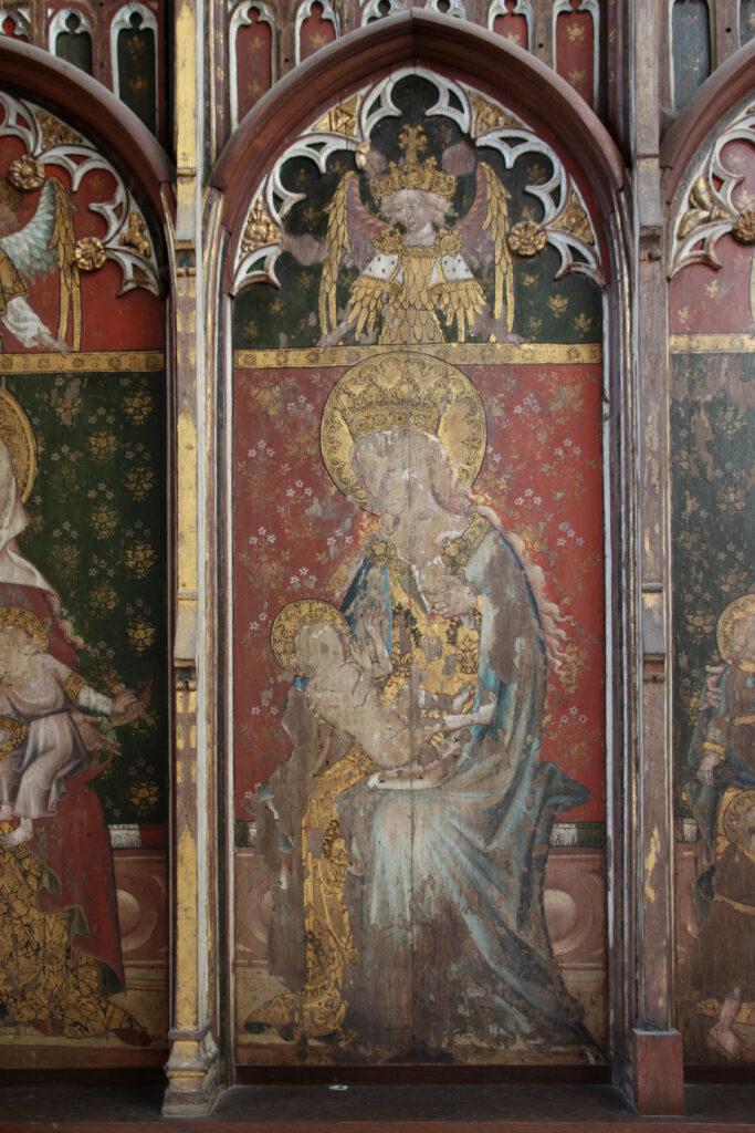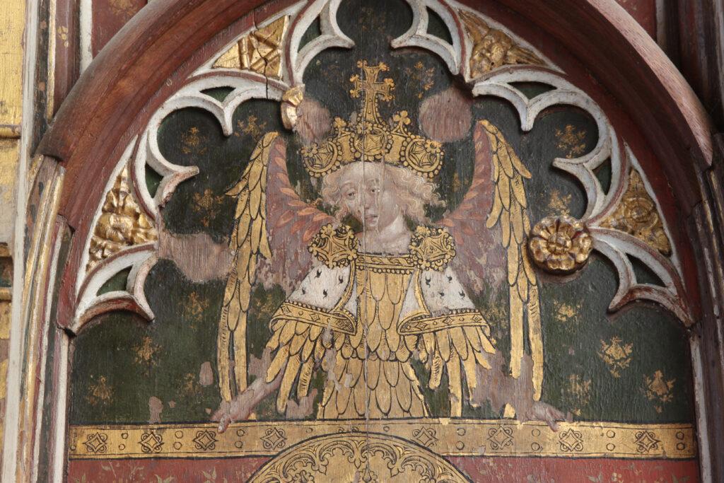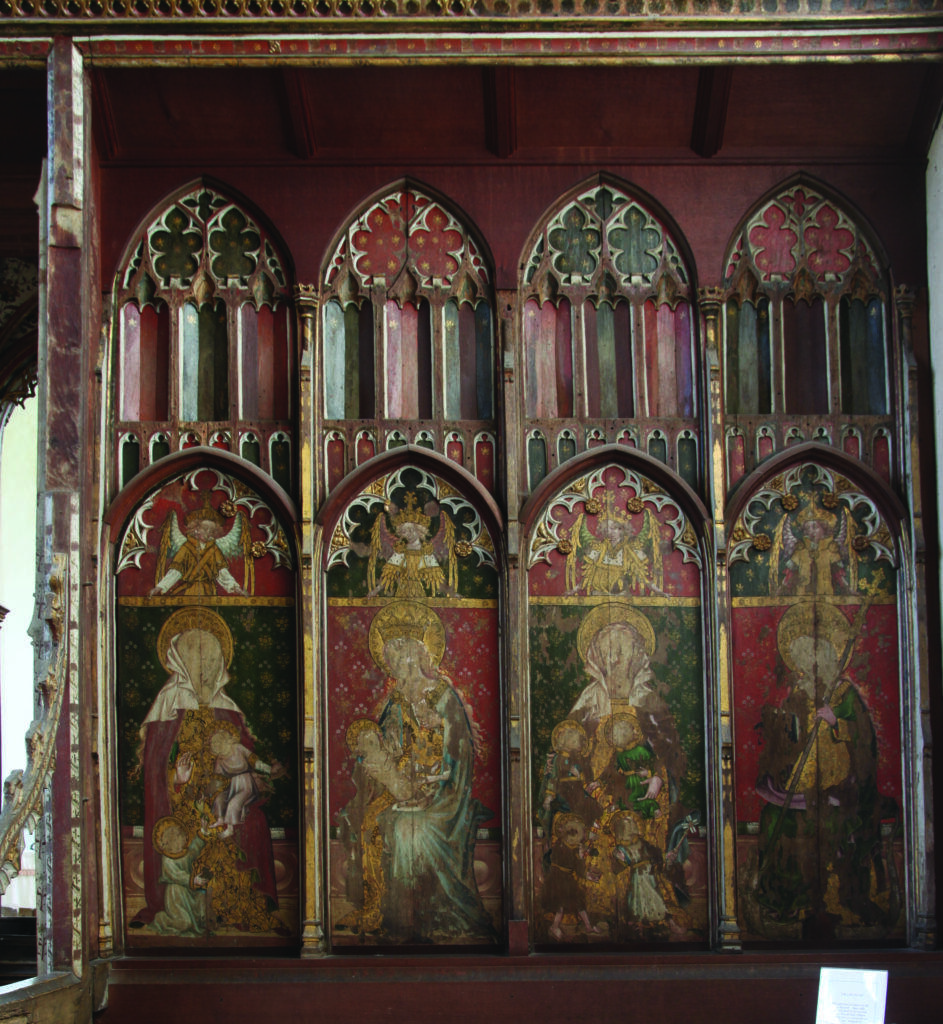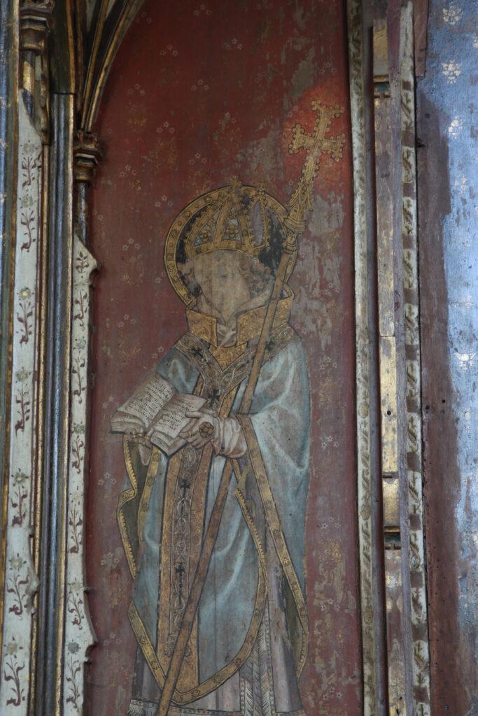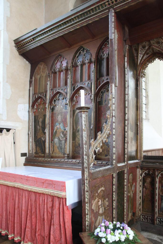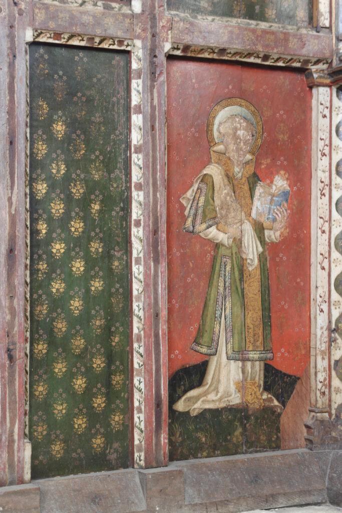 Behind the altar to the north, the screen is decorated with a series of panels containing figures of seated saints. To the far left there is St Etheldreda, the Anglo-Saxon abbess of Ely, and to the far-right St Barbara and early Christian martyr and one of the ‘holy helpers’ who was invoked against sudden death.