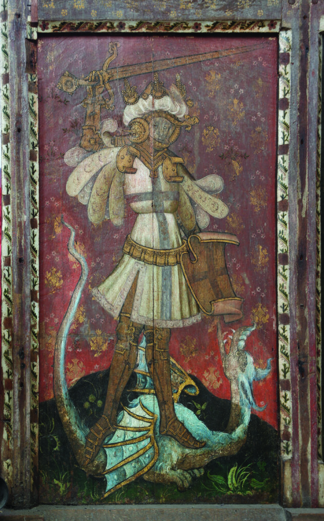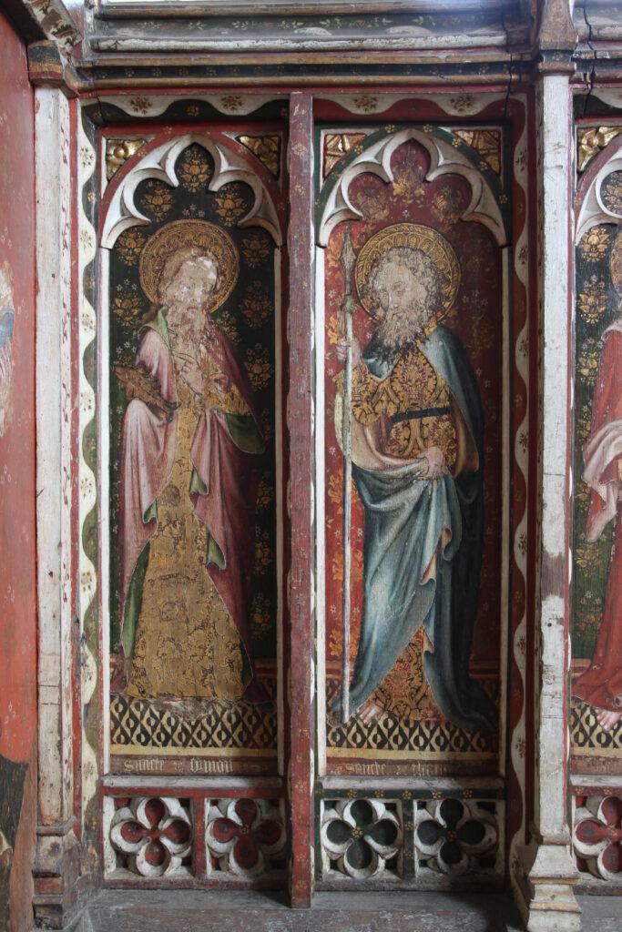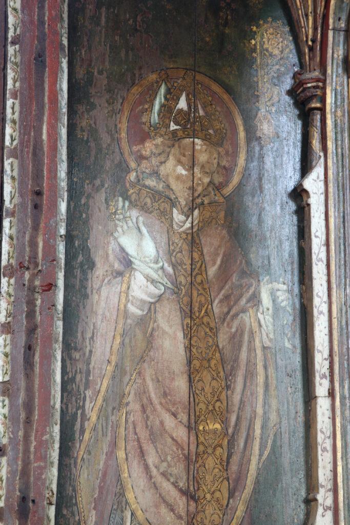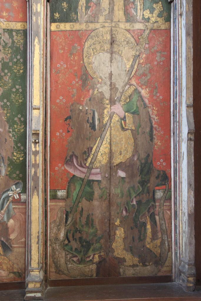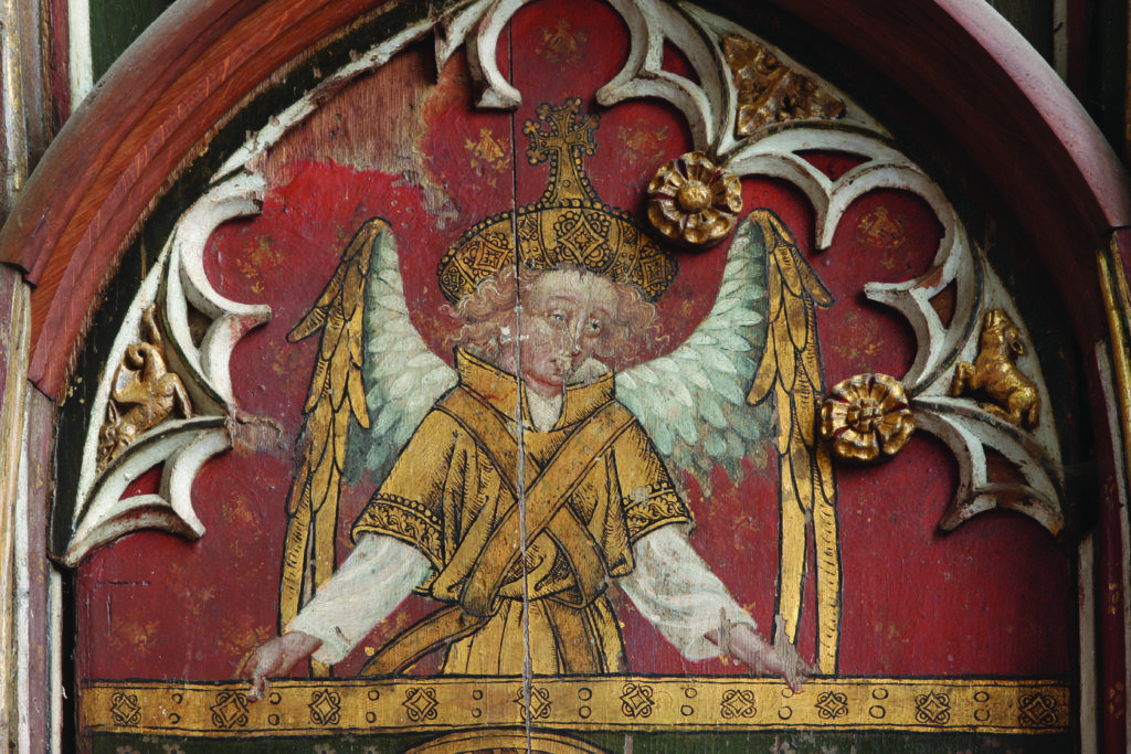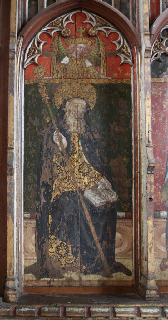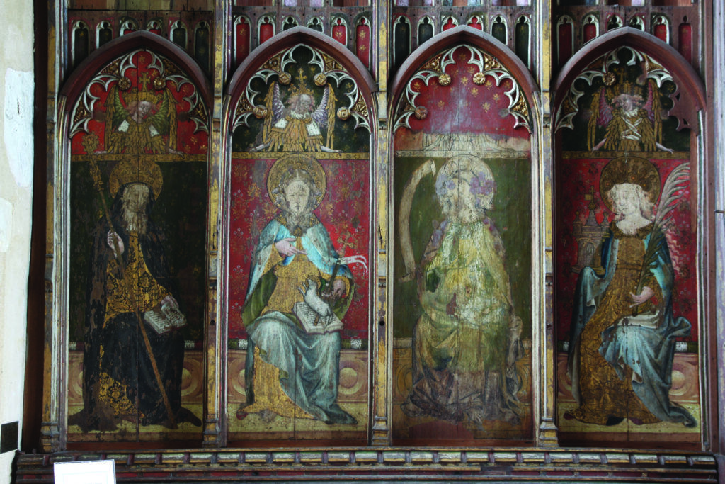 Behind the altar to the north, the screen is decorated with a series of panels containing figures of seated saints. To the far left there is St Etheldreda, the Anglo-Saxon abbess of Ely, and to the far-right St Barbara and early Christian martyr and one of the ‘holy helpers’ who was invoked against sudden death.