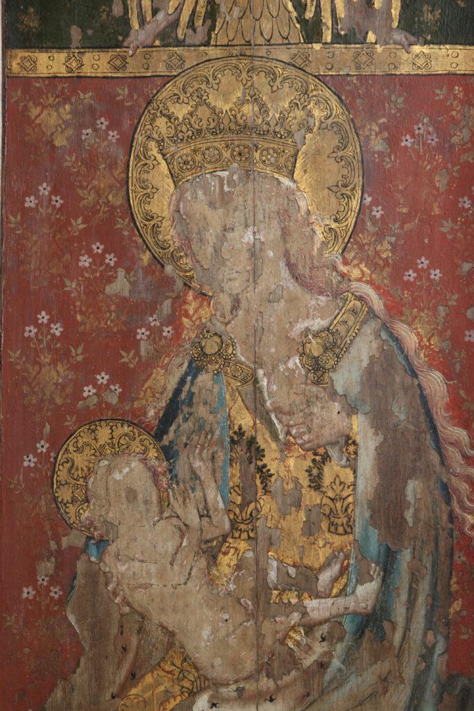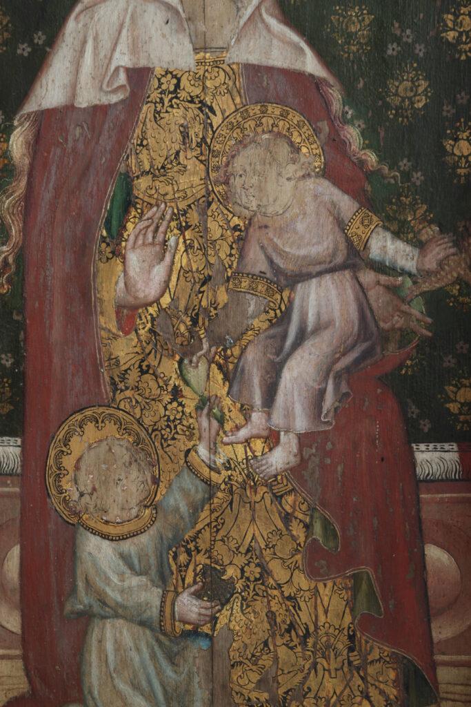 The third panel from the left is rather a conundrum too, it appears that the artist originally intended this panel to have an image of St John the Baptist, but it remained unfinished, and all that can be seen it the preparatory drawing. The preparatory drawing of the angel that would have been above the figure, as in the other panels, has been mostly covered by colour and gilding. All of this suggests that during the execution of the work this panel was abandoned, it was most probably covered up with a three-dimensional sculpture or image of another saint, perhaps given the swap around, an image of a sainted bishop! This image has sadly been lost at the time of the English Reformation. The four figures are set against the backdrop of a ‘cloth of estate’ painted to resemble fine textiles and of the sort that kings and important nobles would have sat beneath in the fifteenth century.