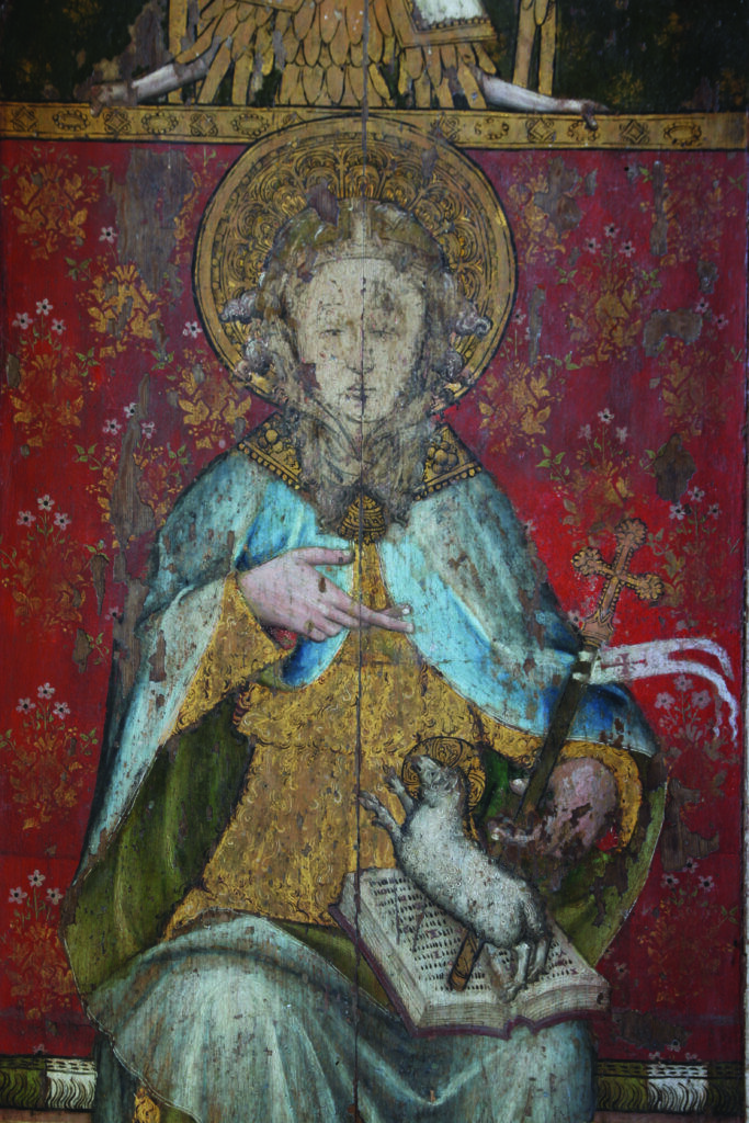 The second panel from the left is a bit of an enigma, as during its painting the image was altered. The figure wears a blue priest’s cope, but the camel hair undergarment of the figure, the evident beard, and the Agnus Dei, the Lamb of God in the figure’s suggests that when finished the painting was of St John the Baptist. Now it has been suggested that the figure was originally that of St Agnes, but I think not, it appears that the artist originally intended it to depict a sainted bishop. On the face the finished paint layer of the Baptist’s image has mostly been lost, to reveal the original underpainting and the face of a beardless man, who is very evidently wearing a bishop’s mitre. Also, under the remnants of the Baptist’s beard appear the folds of an amice, another liturgical garment. The rendering of the Agnus Dei of St John is odd with the saint unusually grasping hold of the lamb’s flag, I suspect is because it began as part of a bishop’s crozier.