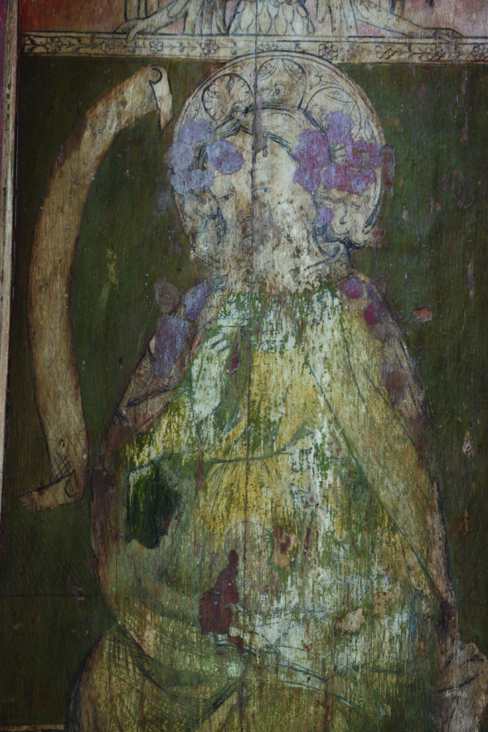 The southern altar is known to have been the lady altar of the church, dedicated to the Blessed Virgin Mary and the paintings date from shortly after 1479. They were the result of a bequest in the will of Robert Iryng, who asked that they be painted ‘of his goods’, i.e. through the sale of his possessions. Directly below this altar is a surviving brass to Roger Iryng from 1487, who is presumably a relative. This bequest demonstrates that the screen was painted piecemeal and through the collective effort of the parishioners.
